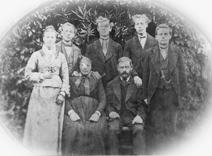 Familie Terhorst 1877 (Silberhochzeit): (v.l.n.r.): Helene (Lena) Terhorst, Bernard Eduard Gisbert Terhorst, Gertrud Terhorst, geb. Hülkenberg, Ferdinand Terhorst, Heinrich Terhorst, Heinrich Terhorst, Johann Terhorst